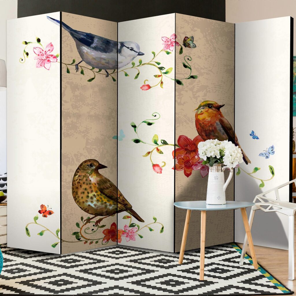 Der RAUMTEILER – VOGELGESANG II eignet sich hervorragend für die Gestaltung ruhiger Zonen in offenen Wohnräumen oder kleinen Wohnungen. Seine ein- oder doppelseitigen Dekorpaneele verleihen dezente Eleganz und steigern den optischen Reiz aus verschiedenen Blickwinkeln. Das faltbare und tragbare Design ermöglicht flexible Gestaltungsmöglichkeiten und bietet dynamische Lösungen für unterschiedliche Einrichtungsbedürfnisse.