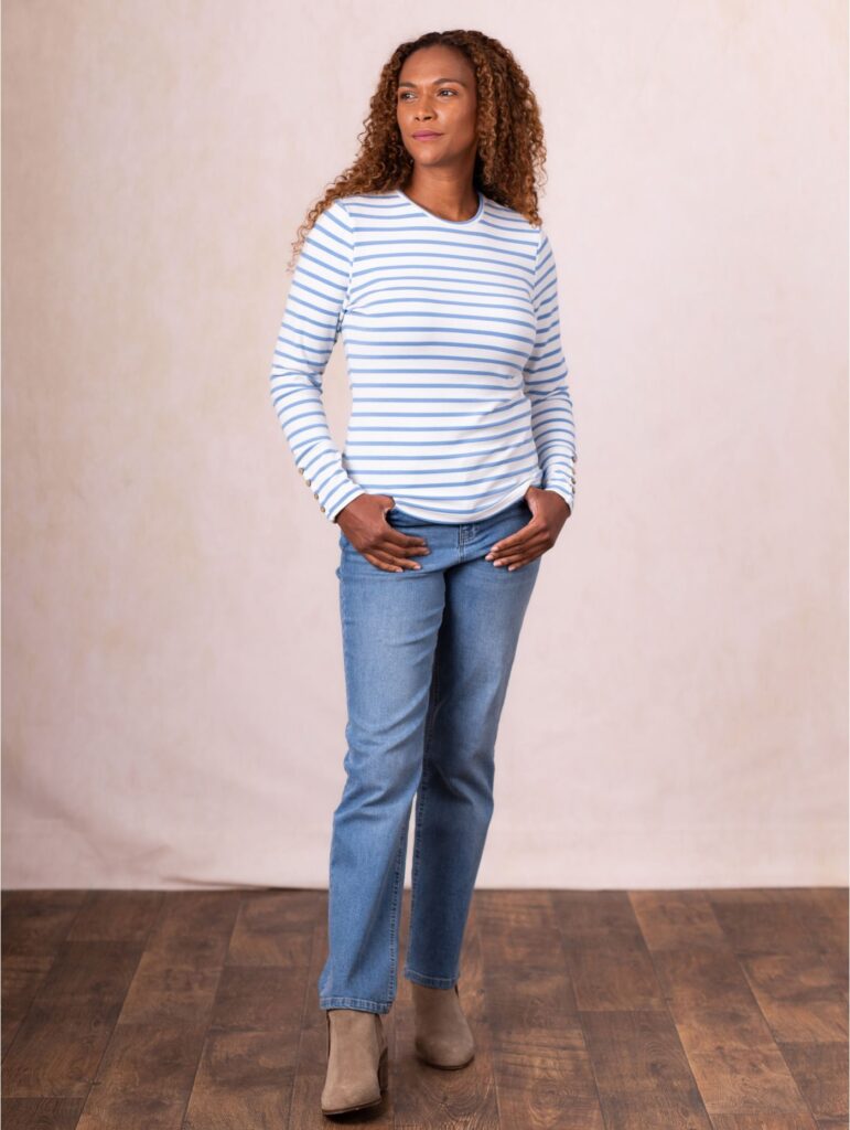 The Everly Striped Top is a modern take on the traditional Breton stripe: the stretchy polyester-viscose-elastane blend of materials (62% Polyester, 31% Viscose, 7% Elastane) makes the piece super-soft, so the comfort is not at the cost of the appearance. Its round neckline and long sleeves and rustic button detailing at the cuffs give the design a balanced shape, which is equally effective with jeans or worn over a jacket. Striped tops tend to be too casual or lack a sophisticated look in a market, so this item is unique in that it is polished and comfortable at the same time.