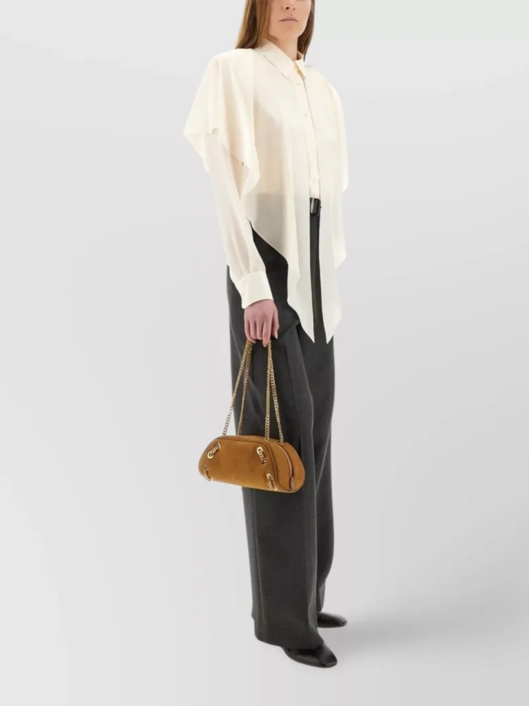 - Long sleeves and pointed collar – traditional shirt elements with new twist.