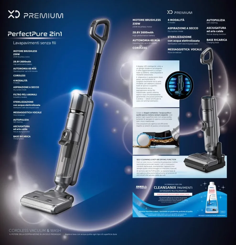 Verranno presentati l’aspirapolvere elettrico ricaricabile 2 in 1 XDSWE33M e il pulitore per pavimenti premium XD, che rivoluzioneranno il modo di pulire la casa. Addio alle lunghe e noiose pulizie con l’aspirapolvere, benvenuta l’innovazione nella pulizia domestica. Questo dispositivo pulisce, disinfetta e rinfresca i pavimenti contemporaneamente grazie alle sue funzioni di aspirazione e lavaggio. Questo aspirapolvere cordless ad alte prestazioni è ideale per le case con più persone o animali domestici. La tecnologia SmartPerfectPure è rivoluzionaria, con un design compatto ed elegante, e in grado di gestire la polvere quotidiana in casa e altri sporchi difficili da pulire.