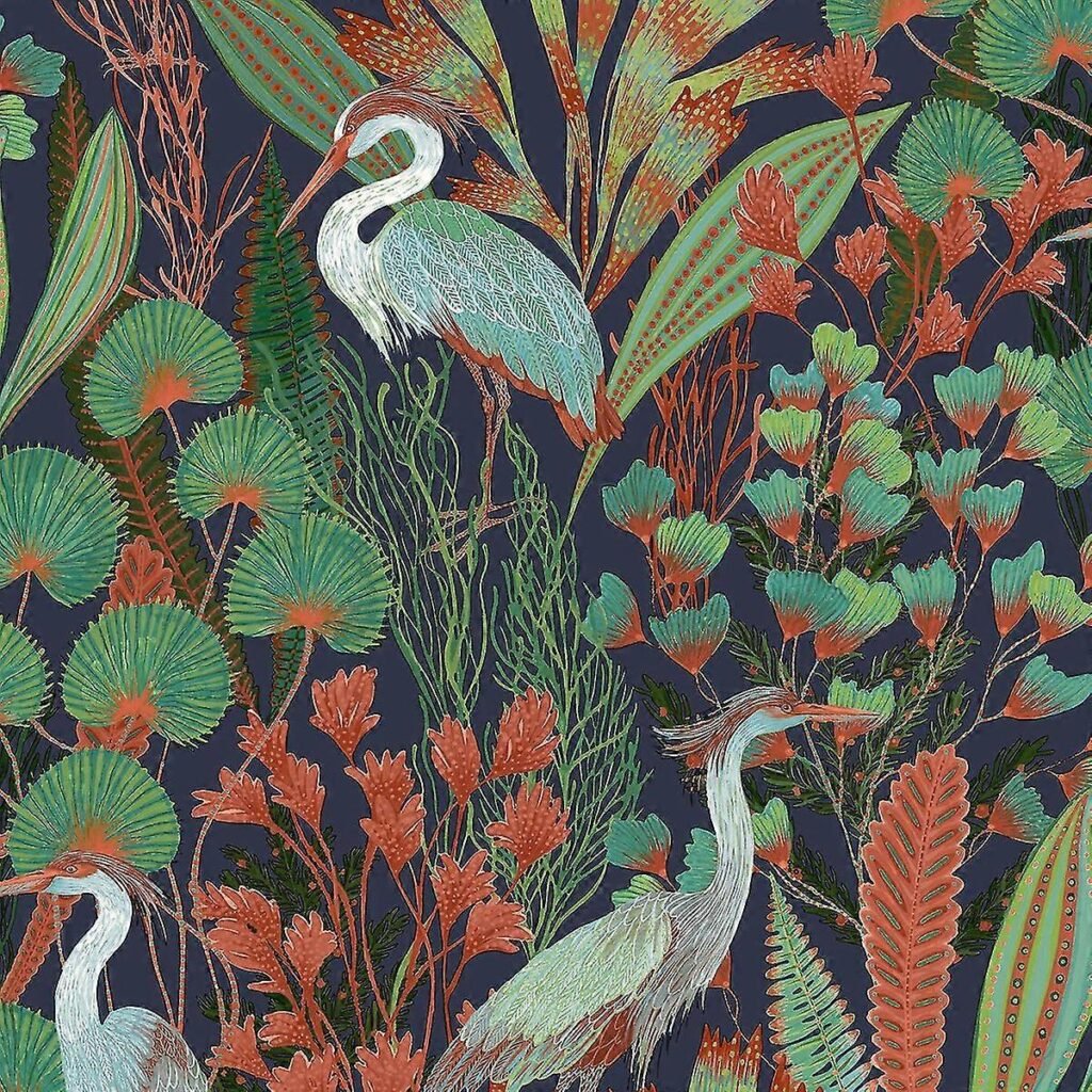 The CIARA HERON WALLPAPER GRANDDECO turns the walls into canvas of beauty. With elaborate depictions of herons standing within greenery, this wallpaper brings in an upscale combination of navy, red and orange colors. Its matte topcoat and premium substrate makes it easy to apply, and it has a smooth appearance when applied as a wall feature or over a whole room. The pattern design of an offset pattern gives the opportunity to repeat seamlessly, which gives depth to the decor and continuity.