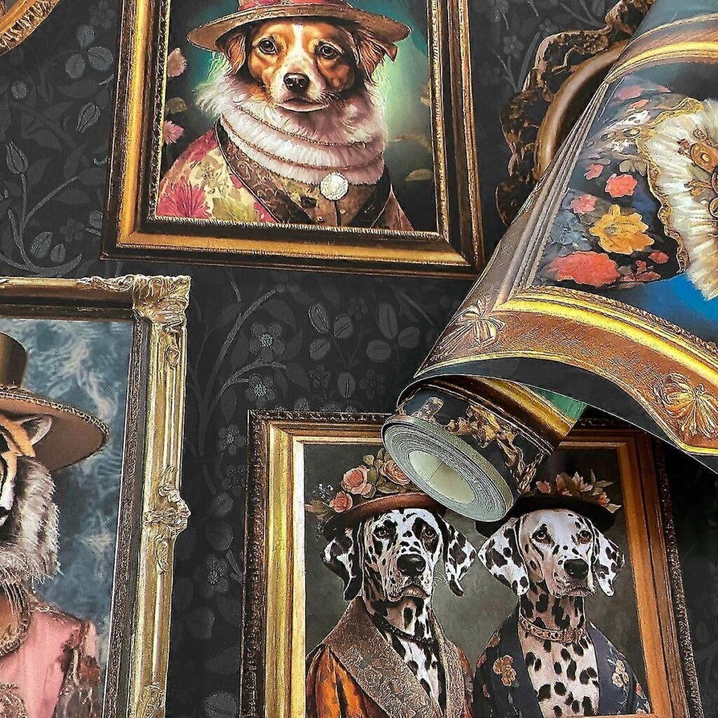 The REGAL BEASTS WALLPAPER HOLDEN produces a stark visual effect within a set of highly detailed pictured animals in Victorian-style clothing. It cosmetizes interiors with drama and sophistication with a background of beautiful leaf patterned in charcoal and grey. This quality, easily applied wallpaper can be used on accented walls or in smaller rooms, giving it a unique, conversation-arousing design element.